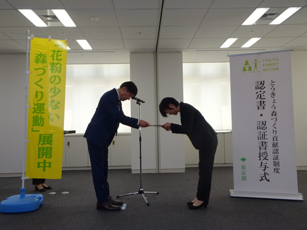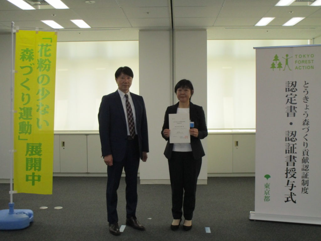 とうきょう森づくり貢献認証制度認定書を授与されました
